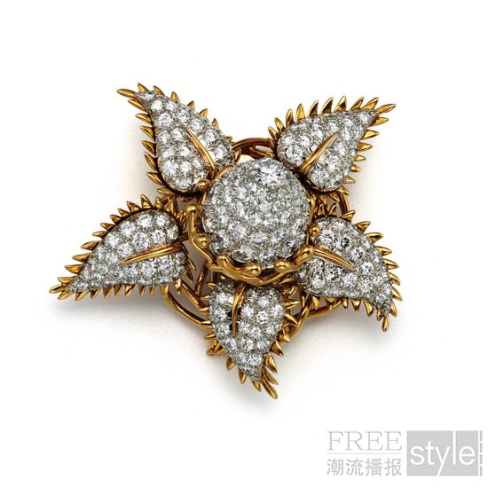 史隆伯杰曾在1963年的一次采访中说道:“我希望我的珠宝兼具佩戴性与实用性,能契合你的生活方式。”这一设计理念,在这两件胸针作品中得到了充分展现。作品中的叶片采用可旋转活动结构,部分可旋转180度露出温暖的黄金背面。无论是日间的温和优雅,还是夜晚的华丽闪耀,都能令佩戴者在不同场合之间自由转换。