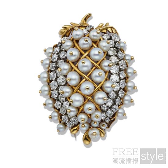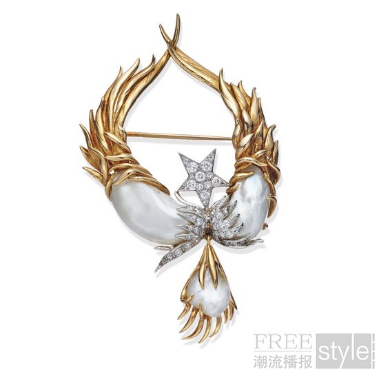 在让·史隆伯杰笔下,寻常之物亦能化为优雅而风格化的作品。其中一件1955年的作品,创造性地将飞鸟振翅的姿态与海蛞蝓的形态相结合。作品中的珍珠被安置于可活动结构之上,使佩戴者可随心调整角度,让珠光在举手投足间轻盈流转。另一件胸针作品,则将珍珠、羽翼与星辰相结合,呈现出深海、天空与宇宙的奇妙相遇。