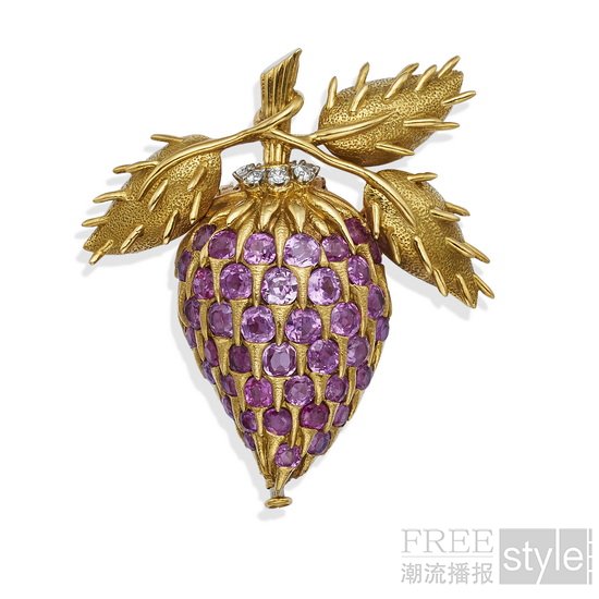 “花园”中不仅有繁花盛放,也有果实累累。让·史隆伯杰在中美洲、加勒比地区与东南亚游历途中邂逅的热带果实,成为他取之不竭的创作源泉。在这组充满趣致的胸针作品中,无论是珍珠与钻石的和谐搭配,还是黄金叶片与粉色蓝宝石的鲜明对比,皆塑造出饱满丰盈的果实形态,在想象与真实间流露出奇幻而生动的生命力。
