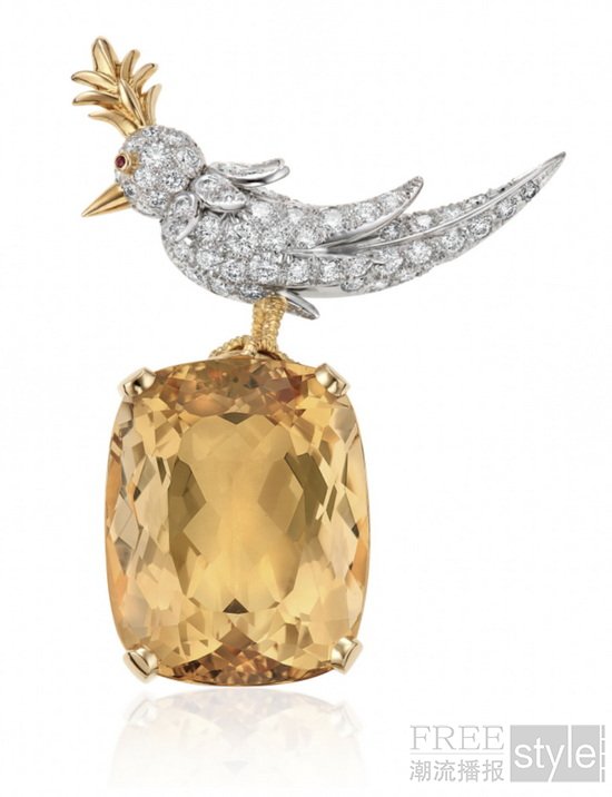 飞鸟是让·史隆伯杰钟爱的创作主题之一,而诞生于1965年的“石上鸟”胸针正是其中最具代表性的作品之一。这一经典设计将一只镶满钻石的小鸟伫立于璀璨宝石之上,优雅中流露出一丝俏皮,时至今日仍持续启迪着品牌设计师们的创作。此次展出的作品以一颗重逾61克拉的黄水晶托起灵动小鸟,是存世最早的“石上鸟”作品之一。