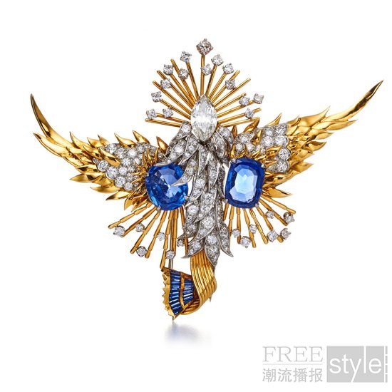 除这一标志性作品外,史隆伯杰同样擅长以天马行空的想象,将飞鸟意象转化为充满奇幻色彩的珠宝设计。这枚极具空灵美感的胸针,以舒展流畅的线条描绘羽翼轻展的姿态,两颗不同切工的蓝宝石点缀其间,于细微的不对称中达成精妙平衡。