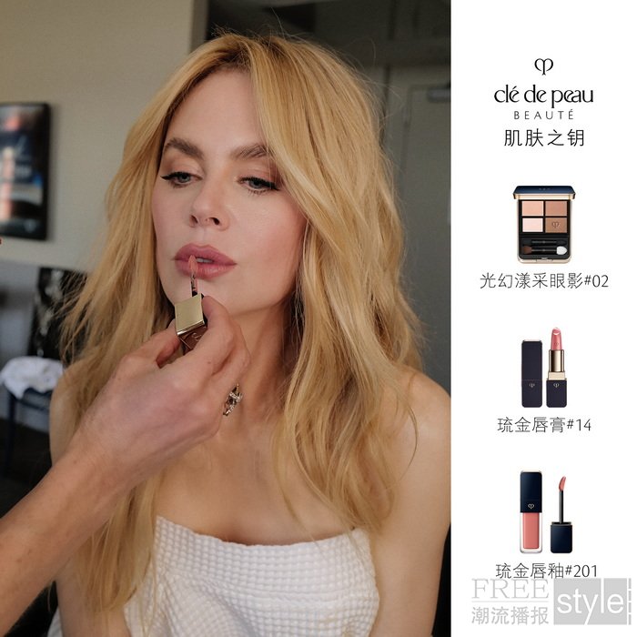 此次妮可·基德曼(Nicole Kidman)的红毯妆容由知名彩妆师古驰·韦斯特曼(Gucci Westman)全程使用CPB肌肤之钥护肤及彩妆臻品倾情打造。她们携手将CPB肌肤之钥的光耀美学化为现实,缔造精致的肌肤轮廓及璀璨妆容,由内而外绽现光耀之力。妆前以多款护肤星品奢护面部,呈绎肌肤透亮饱满的原生光采。配合无瑕精致的底妆修饰面部轮廓,绽熠柔和的肌肤光泽。细腻温柔的眼妆加乘眼部深邃层次感,更有琉金盈采唇釉#201与琉金光缎唇膏#14点缀唇部,以质感妆容诠释现代女性的力量与柔美。