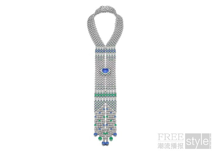 织艺华章(Seres Scarf)高级珠宝项链灵感源自装饰艺术的几何造型与织物纹理,巧妙地将绘画艺术转化为可佩戴的灵动美学。此款珠宝在设计之初,便被构思为如织物般柔顺垂坠,而多样化佩戴作为宝格丽的代表性设计方式之一,在此被提升至全新的创作自由高度。项链以白色18K金勾勒整体轮廓,由超过1,180个独立部件构成,历经逾1,600小时的匠心打造与精细组装,呈现出如织带般流畅的姿态,令人不禁联想到塔玛拉·德·蓝碧嘉(Tamara de Lempicka)画作中女性的绰约风姿。蓝宝石与祖母绿交织出明丽的色彩层次,既可亲密环绕颈间,亦能如瀑布般自然垂落。尤为值得一提的是,一枚可拆卸胸针可随心点缀于项链的不同位置,胸针中央镶嵌一颗重约31.90克拉的糖塔形切割斯里兰卡蓝宝石,呈现出富有雕塑感的造型,令人为之沉醉。