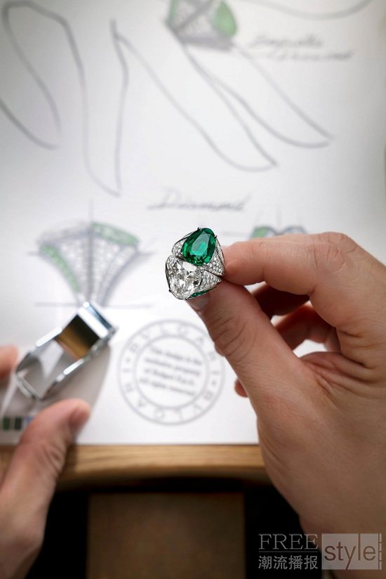 灵感源自弗朗西斯科·海耶兹(Francesco Hayez)名作《吻》(The Kiss)中凝驻的情感,白色18K金打造的秘遇倾心(Incontro Segreto)高级珠宝戒指,将自20世纪80年代起便成为宝格丽经典的“你和我”(toi et moi)双石设计,诠释为一场关于相遇的浪漫宣言。两颗各自蕴含动人故事的宝石,宛如画布上注定相逢的身影,彼此深情对望:一颗重约7.85克拉的古典梨形切割钻石,绽放澄澈的光芒;另一颗重约5.42克拉的哥伦比亚祖母绿,凭借出色净度呈现丝绒般柔润与画意般深邃的质感。密镶钻石勾勒出优美的曲线轮廓,阶梯形切割钻石与buff-top切割祖母绿则营造出雅致的色彩反差。低调的镶座设计进一步凸显了两颗主石的深情“对话”,让这场邂逅鲜明呈现,宝石神韵跃然而出。