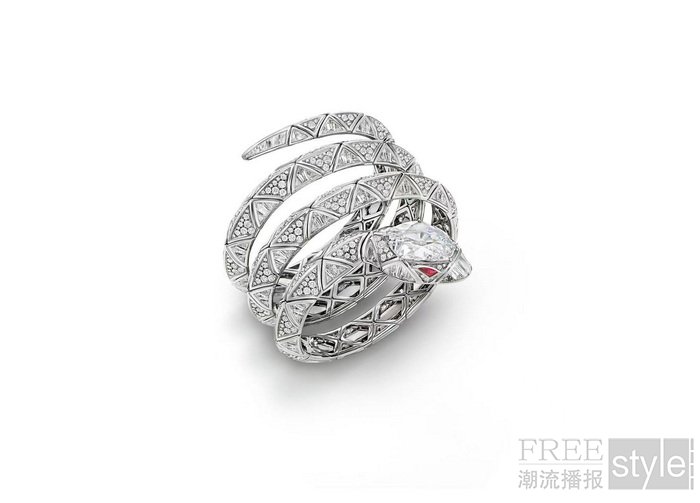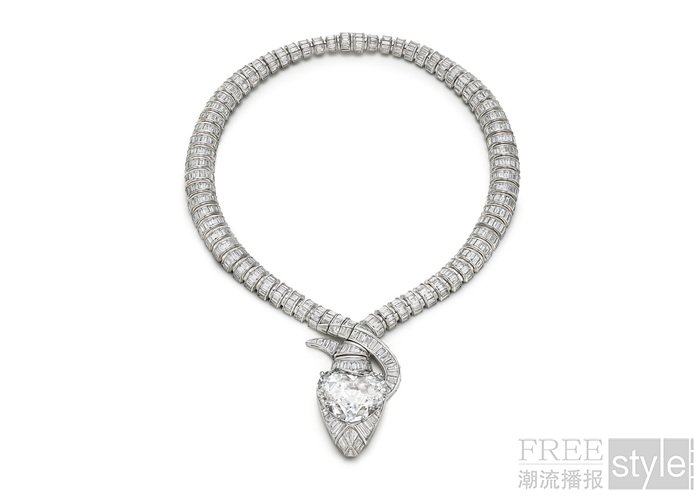 Serpenti永恒之心(Serpenti Imperial Heart)高级珠宝项链采用白色18K金打造,赞颂跨越时光的永恒之美。正如米洛的维纳斯(Venus de Milo)以雕塑之姿倾倒世人,项链的核心元素为一颗承载深厚历史底蕴的戈尔康达钻石,其光芒仿若同样亘古流传。这颗重约30.75克拉的D色IF级钻石由宝格丽受托构思镶嵌设计,以彰显其超然脱俗魅力。钻石巧妙融入灵蛇造型,化作蛇首,特别设计的星形镶座进一步凸显其深邃璀璨光华。整件作品由180个流畅衔接的部件构成,历经逾1,400小时精细打造,在结构张力与光泽质感间达成精妙平衡,演绎雕塑艺术与珠宝创作的谐美交汇。