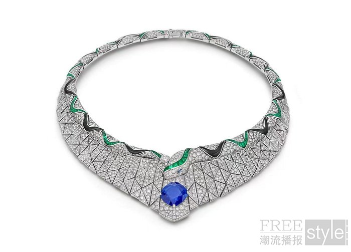 灵蛇幻影(Serpenti Illusio)高级珠宝项链巧妙玩转视觉感知,犹如一场围绕雕塑幻象展开的创意探索。灵蛇身姿并未以实体形态呈现,而是若隐若现于流畅曲线间的留白之处。在宝格丽兼收并蓄的创作理念指引下,雕塑传统通过抽象空间艺术的视角焕发出全新魅力:初看时,它宛如由钻石构筑的迷人几何图案;细品之下,则逐渐显露出当代浮雕般的灵蛇轮廓,其间还巧妙点缀着祖母绿与缟玛瑙。白色18K金项链的中心位置,一颗重约14.01克拉的古典枕形切割马达加斯加蓝宝石呈斜向镶嵌,构成整体设计的核心支点,串联起富有韵律感的三角形设计元素。整件作品由235个部件精心组合而成,历经逾1,300小时手工打造,呈现出层次分明的立体造型,随佩戴者的举手投足流转生辉。