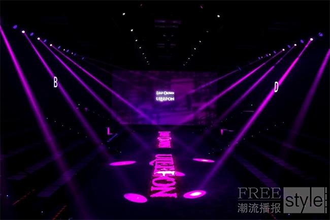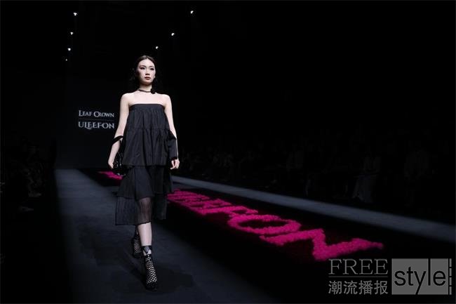 配合现场背景板上“LEAF CROWN × ULEEFON”的投影标识,以及模特面具上的粉色生物纤维装饰,粉色字母装置在黑色秀场中形成一条充满生命力的视觉动线——黑色是生命积累的厚度,粉色是破茧而出的光芒,二者递进呼应,既清晰构建出“从蛰伏到新生”的叙事线,又将“走向重生”的生命哲学与“绿色可持续”的品牌主张直观呈现在观众眼前,实现了时尚美学与环保理念的完美共生。