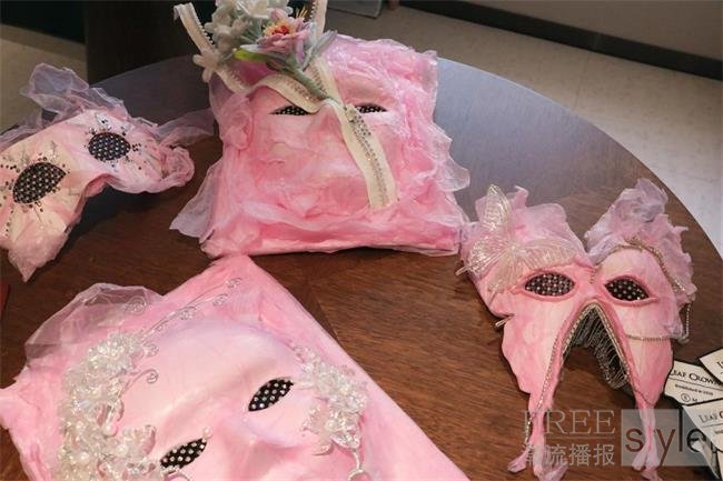 尤为吸睛的是,模特们佩戴着由生物纤维特制的面具:有的是全脸覆盖的粉色生物纤维面罩,有的是半遮眼眸的黑色纤维眼罩,有的是灵动嘭弹的生物纤维苹果肌贴,柔硬碰撞间,既暗藏着破界的张力,又呼应着“重生”的核心主题。她们步伐从容慵懒,裙摆随动作轻轻摇曳,仿佛在演绎生命蛰伏期的沉静与蓄势。