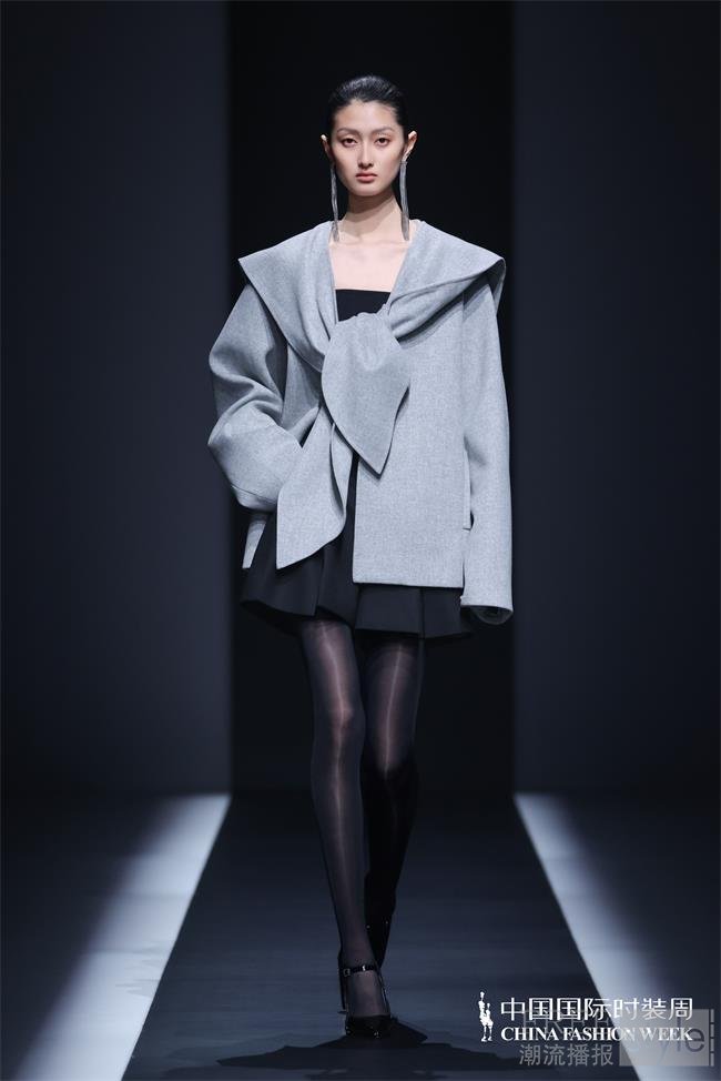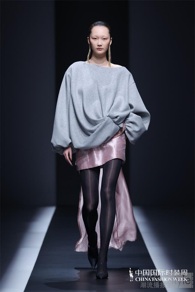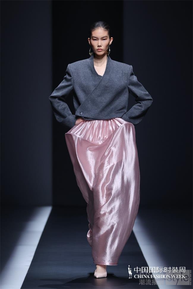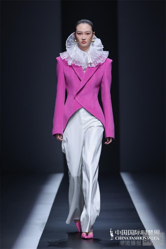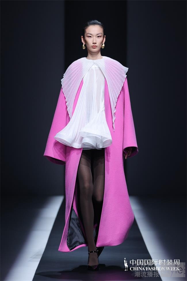 秀场之上,灯光渐亮、旋律奏响,模特身着玫粉色长款大衣,搭配压褶工艺打造的白色花瓣裙优雅登场,将“我”对世界最初的懵懂感知,悄然藏于衣物肌理之中;随着旋律鼓点逐渐加重,象征着成长历程的推进,服装色彩从明艳热烈的玫粉,渐变为低调内敛的炭灰、中灰与浅灰蓝。颈部缠绕的线条、肩部利落的轮廓、胯部扩张的结构、衣身斜向交错的剪裁,生动勾勒出成长路上和谐与冲突共生的状态;最终,以克制沉稳的酒红色调、舒展自在的服装造型,呈现出当下“我”对世界的成熟理解与全新感知。此外,设计师宋双以独特的设计语言,重新演绎16世纪拉夫领与中世纪欧洲裙撑经典元素,融合建筑美学结构特点,打造出极具空气感的造型,成为秀场一大亮点。