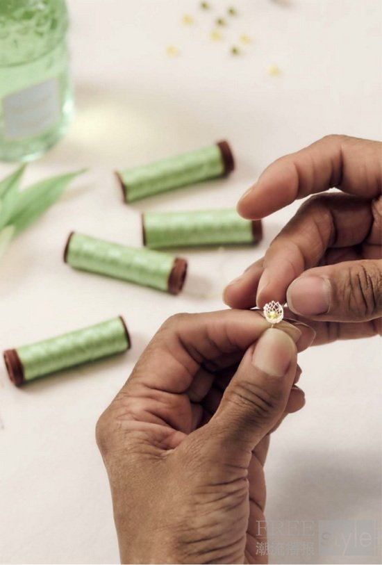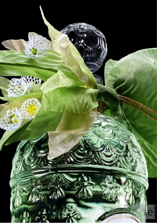 蜂印瓶缀饰由柔软的绿色真丝塔夫绸制成的蝴蝶结。采用经典的绞染工艺用捆扎和加热定型等方法,为蝴蝶结着染别致花纹。Vermont工坊的刺绣工匠以巧手悉心折叠、系扎并固定,打造流光溢彩的精致装饰,在光影流转下映愈显灵动光泽。松紧错落的褶皱纹样,令整件作品如微风轻抚的绿叶般,跃动着蓬勃生机。柔软丝绸缠绕瓶颈,宛若蜿蜒藤蔓,亭亭玉立。精巧的手工刺绣蕾丝铃兰点缀其间。每一朵铃兰小花仿佛从缎带中生长而出柔美与张力相得益彰,将铃兰绽放的瞬间优雅定格。