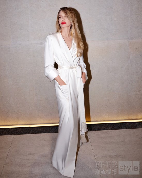 传奇巨星安吉丽娜·朱莉身着 TOM FORD 2026 夏季系列米白色真丝斜纹布青果领长袍亮相。真丝斜纹布流淌温润光泽,长袍廓形随性垂坠,于步履间轻拂出慵懒而高贵的韵律。以浑然天成的优雅气韵,诠释超越时间的传奇魅力。