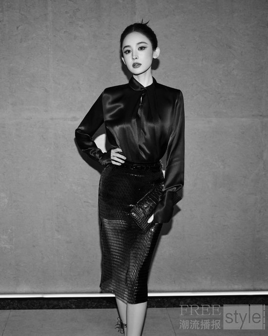 TOM FORD BEAUTY 中国区大使娜扎身着 TOM FORD 2026 夏季系列黑色镂空漆皮皮革铅笔裙,搭配黑色真丝乔其纱衬衫。漆皮肌理冷冽耀目,镂空剪裁勾勒凌厉线条;真丝乔其纱轻垂柔婉,刚与柔于一身默契相融。锋芒与魅惑交织共生,于镜头前诠释独树一帜的暗黑摩登格调。