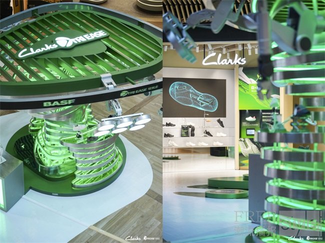 空间的视觉叙事,始于外场的一座“能量脉络”未来感装置。它跳脱了传统静态陈列的框架,以机械臂与能量等高线,构建了一个持续“生长”的、充满未来诗意的有机体。其灵感内核植根于“一生二,二生三,三生万物”的东方哲思,凝练地诠释了Clarks与巴斯夫联合研发的核心理念:一为品牌对“行走”本质的深究与实验,二为诞生于理念下的TRIEASE轻松走鞋履,三则是支撑这次“行走再进化”的三大科技革命。整个装置由两部分构成:一部分源自TRIEASE轻松走的AIGC宣传片,将脚部的压力、能量等生物力学数据,转化为流动的等高线图谱,呈现出充满未来感的“机能美学”;另一部分则是冷静运转的自动化机械臂,精准复现着“立体喷涂”的核心工艺。一动一静之间,宣示着品牌对未来步行方式的构想——更高效、更科学、更可持续。生机绿作为主视觉色彩贯穿始终,渲染出兼具理性与生命力的独特氛围。