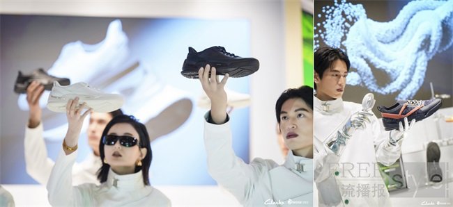 整场发布,被打造为一次极具先锋感的沉浸式创意秀。它超越了传统T台与定点的限制,模特是这场实验的主角——他们身着白大褂,以未来科研人员的姿态散落在空间各处,并将TRIEASE轻松走产品作为核心“实验样本”,以行为艺术的方式呈现。随着实验进程进入高潮,他们同步脱去实验外衣,以充满未来感的造型,释放松弛而自信的时尚能量。TRIEASE轻松走系列在这群“未来行者”脚下,完成了从理性解构到感性释放的完整叙事。秀的终章,两位机器人携新鞋登场,Clarks大中华区总经理Rebecca Chen女士与巴斯夫亚太区鞋履/运动/休闲业务总监吴小军博士一同,将承载着数据与理念的TRIEASE轻松走嵌入核心装置。顷刻间,装置脉络与嘉宾手环同步点亮,象征着舒适科技的进化图谱被正式开启,一场关于行走的未来实验,就此启程。