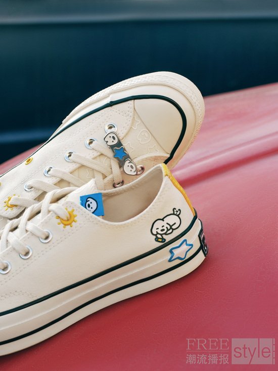 本次 CONVERSE X MATSUI 联名系列围绕经典 CHUCK 鞋型展开,将艺术家标志性插画语言融入复古结构之中。系列带来两款 CHUCK 70 联名鞋型,多彩70高帮鞋款通过不对称撞色设计呈现更鲜明的视觉层次,鞋侧点缀联名图案,并搭载 ORTHOLITE 缓震中底,在经典外观之中兼顾舒适脚感。彩绘70低帮鞋款延续条纹橡胶鞋底与帆布鞋面结构,以更轻松的配色与插画细节呈现自然随性的风格表达与高级质感。两款鞋型均附带多组鞋带,并配有联名配件包,让风格切换更加自由。