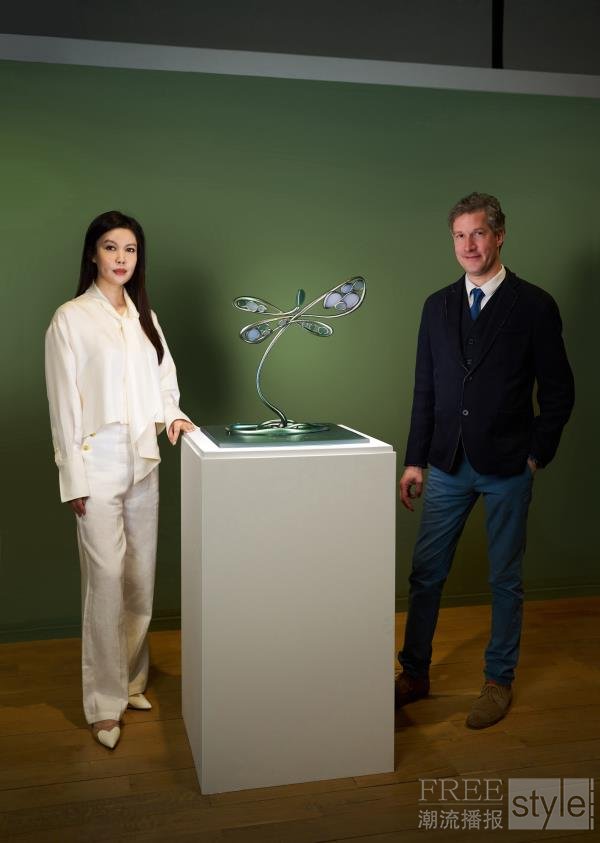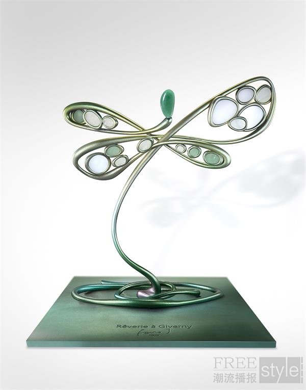 以钛合金为主体结构, 在表面手绘晕染色辅以电镀, 充满油画调色丰富的冷暖变化,而蜻蜓翼框内镶嵌着切面蓝色玉髓、岫玉、东陵石, 一只融合水墨与油画感的蜻蜓雕塑, 就仿佛被 “画”出来了。