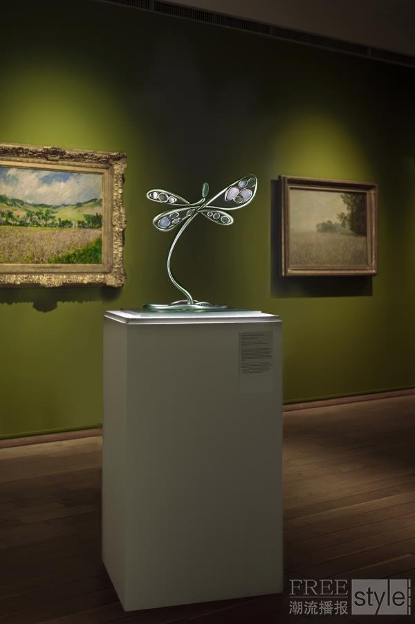 “Rêverie à Giverny 浮生梦”呈现一只点水跃涟的“蜻蜓”。“蜻蜓”是丰吉对Jardin de Giverny(吉维尼莫奈花园)的最深印象,“在Jardin de Giverny,别人都看见睡莲池塘,而我则看见蜻蜓,我觉得睡莲是背景舞台,蜻蜓才是翩翩起舞的主角。”丰吉回忆诉说着。“我一直钟爱蜻蜓,蜻蜓有中国文化中的轻、灵与含蓄,淡淡飘逸却能四两拨千斤。”丰吉说:“构思时一口气不间断地勾画雕塑外形,整个雕塑实际就一笔勾勒而出,也暗涵生命短暂无常,如浮生一梦瞬逝。”