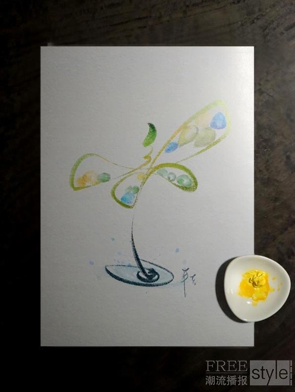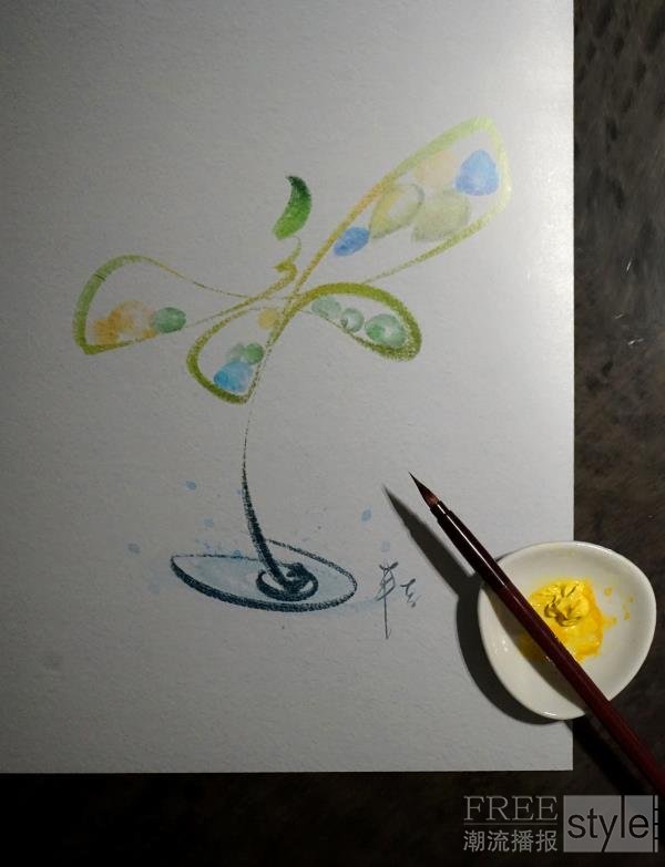 源于幼时研习书法,从头至尾以草书线条,一笔勾勒出点水跃起的蜻蜓外形。