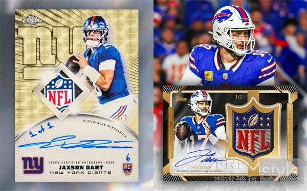 • 象征NFL单项球员荣誉的金色Logo签名卡:此系列旨在致敬联盟精英中的精英。每张卡片镶嵌着上赛季各奖项得主所穿着球衣上的金色NFL LOGO实物,将那些定义职业生涯的荣耀时刻凝于方寸之间。本系列囊括的球员包括:约什·阿伦(MVP)、萨奎恩·巴克利(年度最佳进攻球员)、帕特里克·瑟坦二世(年度最佳防守球员)、杰登·丹尼尔斯(年度最佳进攻新秀)和贾里德·威尔斯(年度最佳防守新秀)。