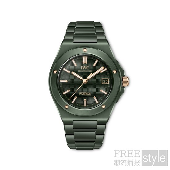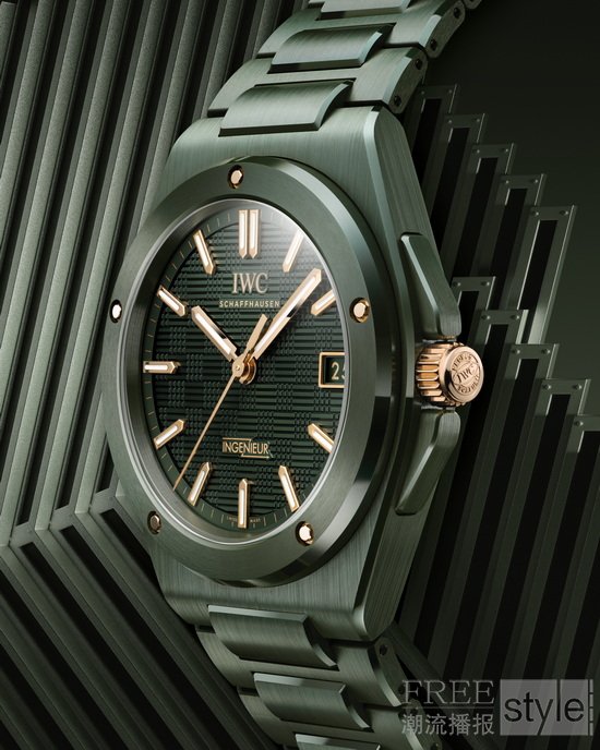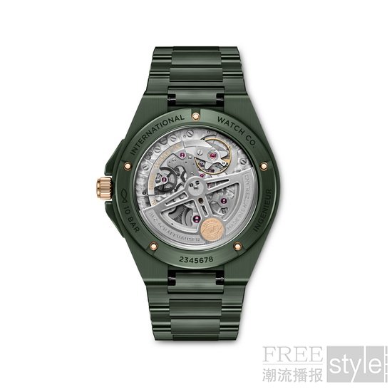 工程师系列自动腕表42(型号:IW338902)的表壳衬圈、表圈、表底环及表冠保护装置均采用暗橄榄绿色陶瓷打造。彩色陶瓷由氧化锆与其他金属氧化物以精准比例混合制成。由于陶瓷在烧制过程中会发生色泽变化,要使不同部件实现均匀色调是极为复杂的工艺挑战。陶瓷材质较精钢更为轻盈,一体式陶瓷链带通过中间链节与表壳无缝衔接,设计符合人体工学,佩戴舒适。“网格”纹表盘采用与陶瓷部件相同的绿色调。这款工程师系列自动腕表42新作更以金色点缀彰显独特气质,表冠由18K 5N金打造。用于固定表圈与表壳衬圈的功能性螺丝则以18K Armor Gold®硬金材质制成,硬度较传统金质合金显著提升。指针与镶贴时标经镀金处理,均涂覆Super-LumiNova®夜光涂层。
