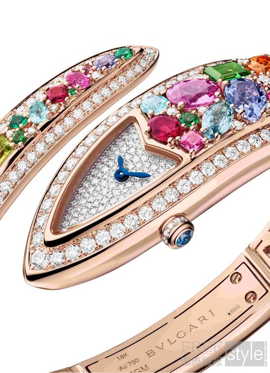Serpenti Aeterna系列腕表密镶闪耀宝石,其跳跃灵动的宝石排布将简洁线条延展为富有雕塑美感的整体造型,兼具灵动意趣与珍贵质感。腕表中,宝格丽采用不同尺寸、切割工艺与色调的宝石,谱写一曲和谐共鸣的乐章。于绚烂的色谱中,每一颗宝石皆彰显其鲜明个性,共同铸就魅力天成的美学风范。