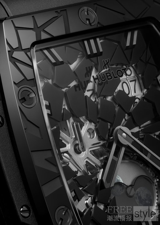 源自2016年Big Bang Impact Bang腕表的碎片图案设计,突破传统宝石镶嵌技艺的边界,重新诠释了视觉张力。2026年,这一设计理念再度演进,融汇钻石、锇金属等多种材质,并搭配抛光镀铑镶贴与镀黑元素焕新呈现。碎片自表圈延展至蓝宝石表盘,并环绕于6点钟位置的月相显示盘四周。每一枚镶贴元素均由手工定位,并以微米级精度精准固定。