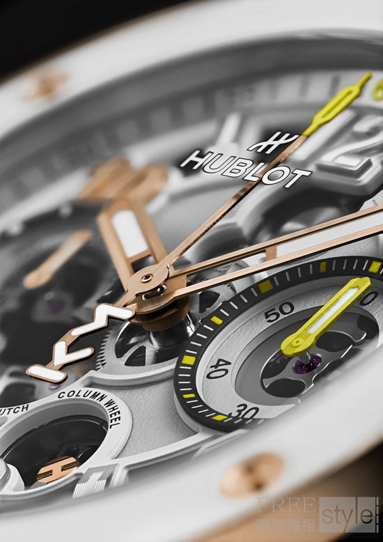 Big Bang Reloaded基利安·姆巴佩腕表,以姆巴佩的独特设计语言重新定义时计美学。表圈6点钟位置镌刻着他的信条与处世哲学:“Trust Yourself”。王金色调的数字10璀璨醒目,致敬他标志性的球衣号码、球员身份以及他始终信奉的幸运数字。表壳巧妙融合了抛光18K王金与微珠喷砂白色陶瓷——白色寓意他内心的纯粹,王金则象征着他澎湃的雄心。镂空表盘经哑光烟灰色镀钌处理,点缀白色元素,赋予这款计时码表迷人的现代风范与充满科技感的锐利锋芒。腕表提供两条可快速更换的“一键式”表带:一条为王金色Velcro尼龙织物表带,另一条为黑白双色橡胶表带,内衬低调镌刻着KM标志。透过蓝宝石表背,HUB1280 Unico表厂自制飞返计时机芯的精妙运转一览无余,其表盘侧设有导柱轮,动力储存长达72小时。这款Unico机芯无疑是腕表的视觉焦点:导柱轮、摆动离合器及飞返功能如今以前所未见的清晰姿态呈现。黄色与王金色调细节凸显了腕表的关键设计元素,以此致敬姆巴佩在绿茵场上屡创纪录的里程碑时刻及其热血激情的竞技风格。双层表圈由18K王金与白色陶瓷打造,以六颗H形王金螺丝固定。Big Bang Reloaded基利安·姆巴佩腕表,专为那些敢于决胜一击的人士而生。