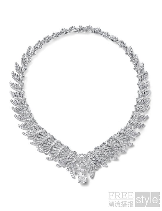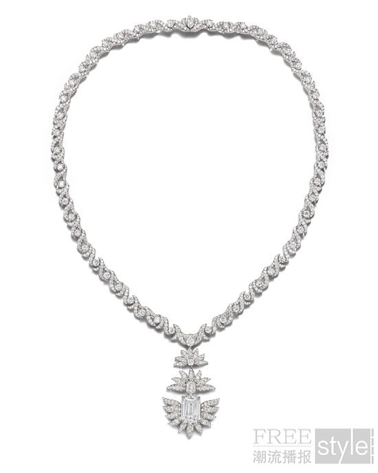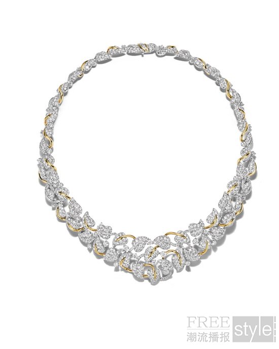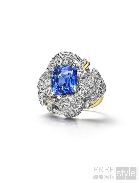 让·史隆伯杰曾创作出一款经典项链,一只帝王蝶翩然点缀其上,若隐若现,意趣盎然。蔓隐蝶踪(Monarch)主题从这款典藏作品中采撷灵感,以手工雕琢的铂金、18K黄金及铺镶钻石,焕新演绎藤蔓交织、叶片层叠的生动意象。繁茂叶片间,精心镶嵌来自斯里兰卡与马达加斯加的未经优化处理枕形切割蓝宝石,色泽出众,相映成趣。同主题的钻石作品,则以叶片造型凸显璀璨非凡的钻石。其中最具代表性的当属一对耳环,镶嵌祖母绿形切割D色无瑕级IIa型珍罕白钻,总重逾10克拉。该主题作品中铂金与黄金的结合,充分彰显出蒂芙尼在双金运用方面的深厚造诣。