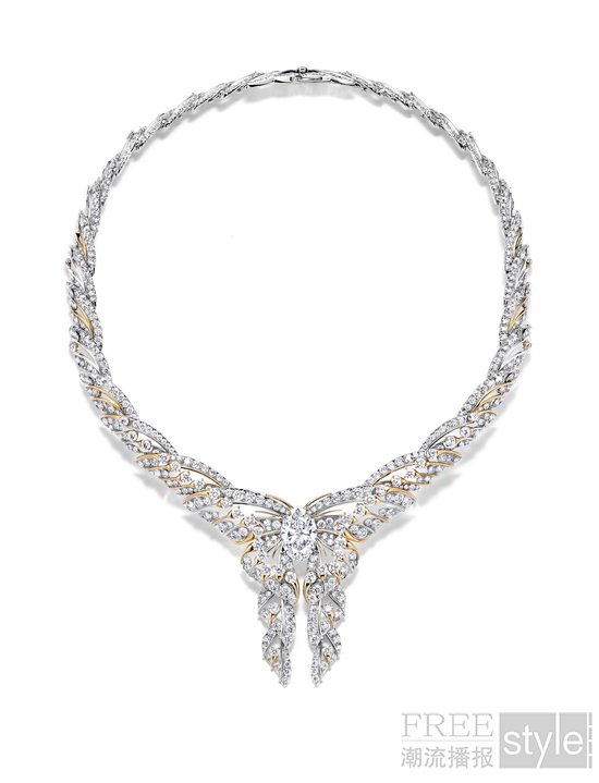 春季新作聚焦“蜕变与新生”,以自然的周而复始为叙事主线,通过手工打造的黄金藤蔓、铂金叶片与几何结构,演绎盎然生机与动态美感。彩翼蝶梦(Butterfly)主题从蒂芙尼历史上的经典元素中汲取灵感,以未经优化处理的帕帕拉恰蓝宝石与蒙大拿蓝宝石,呈现粉橙色与靛蓝色的细腻交织,再现蝴蝶振翅时转瞬即逝的灵动风姿。该主题的另外两组钻石作品同样各具巧思:一组以精心甄选的艳彩黄钻点缀抽象蝴蝶造型,另一组则以椭圆形白钻展现蝴蝶的轻盈之美。为呼应“蜕变”这一主题,部分吊坠可转换为胸针佩戴,彰显了蒂芙尼长久以来对多用途佩戴珠宝设计的不懈追求。