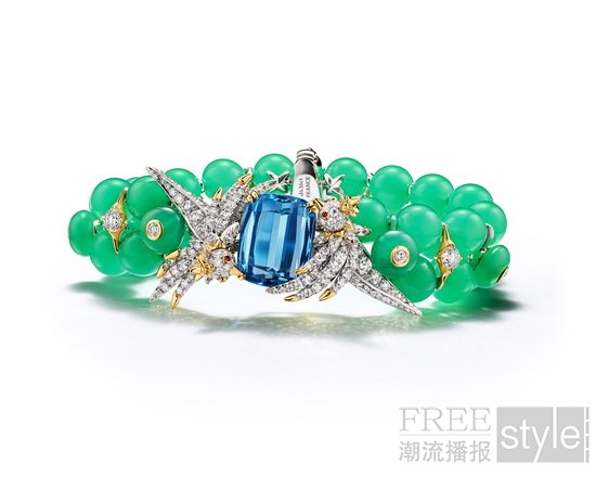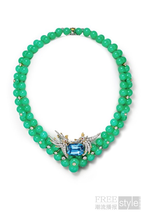 “石上鸟”(Bird on a Rock)主题中,品牌经典小鸟设计再度振翅焕新,悄然停驻于来自巴西的枕形切割圣玛丽亚蓝色调的海蓝宝石之上。定制切割的绿玉髓珠铺陈出一片生机盎然的翠绿景致,将海蓝宝石的饱满蓝调映衬得愈加深邃动人。其中一款项链以一对栩栩如生的小鸟簇拥一颗重逾22克拉的海蓝宝石,采用可转换式设计,亦可作为胸针佩戴。