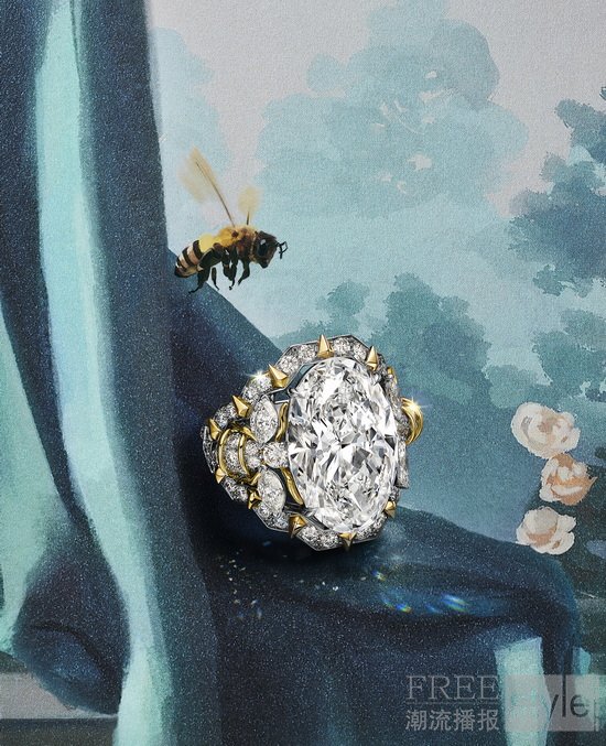 蜂萦流光(Bee)主题以让·史隆伯杰经典的Two Bees戒指为灵感,将蜂巢的几何结构与自然的灵动律动巧妙融合。耀目的椭圆形钻石镶嵌于六边形几何结构之中,在18K黄金的点缀下愈显流光溢彩。该主题最引人注目的作品是一枚戒指,镶嵌一颗D色无瑕级IIa型珍罕白钻,重逾10克拉。若隐若现的蜜蜂造型环绕钻石四周,为整体设计平添一抹盎然意趣。