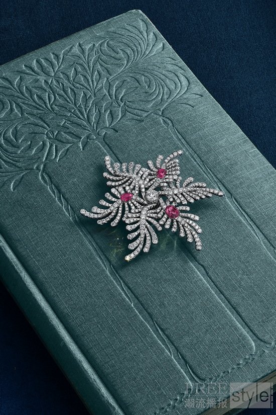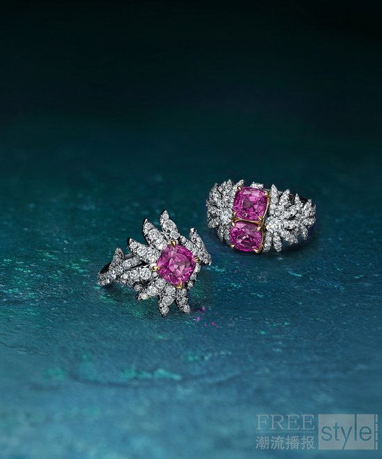 作为春季新作的终章,棕榈叠影(Palm)主题以未经优化处理的椭圆形莫桑比克红宝石,点缀于蜿蜒舒展的叶片间。这些由品牌匠心甄选的红宝石,呈现出和谐统一的明艳色泽与动人荧光,充分彰显蒂芙尼在宝石探索领域的卓越传承。在同主题的另一套作品中,璀璨钻石如流瀑般倾泻而下,生动捕捉阳光穿透叶隙时的跃动光影。