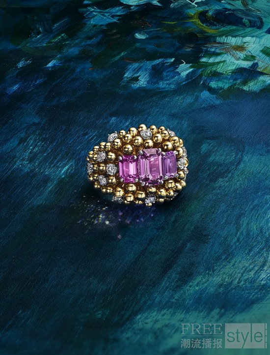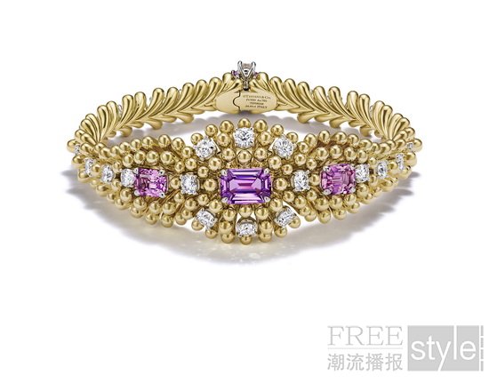 在2026 Blue Book高级珠宝系列中,花卉意象各放异彩。茉影织韵(Jasmine)主题以精巧铂金编织元素勾勒花架结构,再现让·史隆伯杰于1961年至1962年间设计的作品,其中一款项链更于“花架”之上镶嵌一颗重逾18克拉的D色无瑕级IIa型珍罕白钻。同主题的另一套作品则聚焦枕形切割紫锂辉石。作为“蒂芙尼传奇宝石”之一,紫锂辉石不仅为整体设计注入动人光彩,亦于部分设计中以柔和色调巧妙衬托茉莉花造型。春菊含芳(Marguerite)主题运用两种截然不同的设计手法,以雕塑感十足的铂金花瓣诠释雏菊元素:其中一套作品以未经优化处理的粉色蓝宝石,塑造柔美鲜活的雏菊造型;另一套则以祖母绿形切割钻石解构雏菊形态,巧妙运用空间留白,呈现大胆而独具匠心的设计。金蕊绽芳(Bloom)主题以柔和的粉色蓝宝石、紫色蓝宝石搭配钻石,定格花朵即将绽放的瞬间美态。值得一提的是,系列其他主题均采用铂金或铂金与黄金组合设计,该主题作品则均以18K黄金打造。