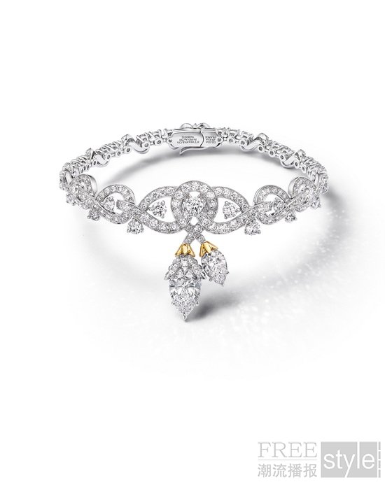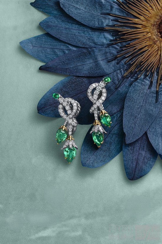双蕾悬蔓(Twin Bud)主题以蜿蜒缠绕的铂金藤蔓创新演绎让·史隆伯杰的典藏设计,并分别以一套未经优化处理的赞比亚祖母绿作品和一套钻石作品,定格双生花蕾悬于瞬间的灵动之美。在祖母绿作品中,梨形与蛋面形祖母绿沿着雕塑般的藤蔓,化作盎然绽放的花蕾。藤蔓之上,明亮式切割与精密切割的钻石交相镶嵌,并点缀18K黄金元素,进一步营造出丰富质感与立体层次。钻石作品中,曼妙的铂金藤蔓沿肌肤勾勒出优雅曲线,点缀着黄金元素的花蕾错落分布,最终凝于璀璨夺目的梨形钻石之上。