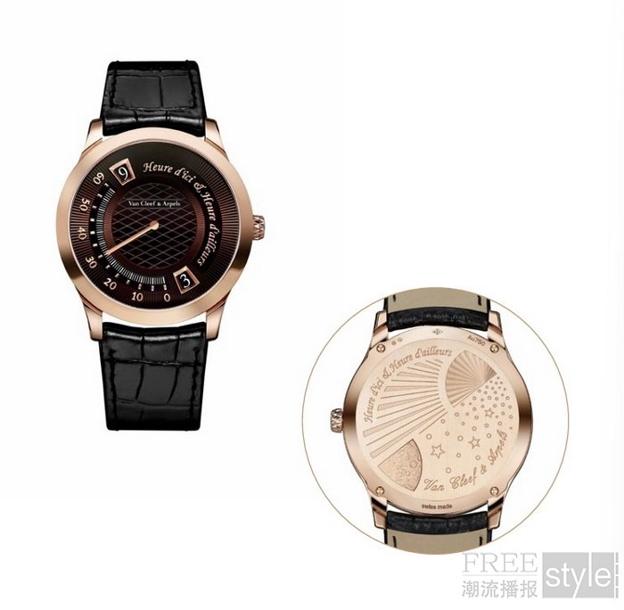 38毫米Midnight表壳的设计突显和谐平衡之美:表壳及时标以抛光与缎面处理的玫瑰金打造,与表盘上浮雕珐琅的细腻色调互为映衬,其棕褐色调随光线流转,绽放或温煦或冷冽的光芒。表盘饰以放射状玑镂雕花纹理,围绕中央piqué凸纹图案打造的Van Cleef & Arpels梵克雅宝经典标志散射而出。简约纯粹的线条与不对称的装饰元素彼此呼应,彰显世家独特的美学风格;表盘上流畅书写的表款名称,向文字所承载的诗意致以深情礼赞。表底盖镌刻一轮皎洁明月,静沐于玑镂雕花太阳所散发的璀璨光晕之中,如星夜低语,蕴藏诗意哲思。