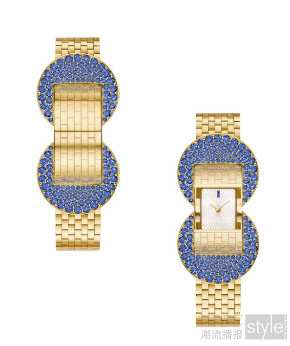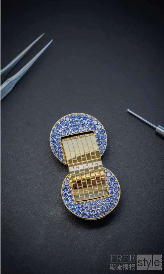 Ludo Secret腕表新作镶嵌以蓝宝石,延续这一系列的设计,重新演绎1949年的经典款式。镜面抛光黄K金如砖块般拼凑成巧若灵蛇的结构,温柔环抱手腕。每一枚铰件均以巧手精工装嵌,交织出柔软灵动的设计,好比细意织造的绛纱。黄K金绽放如阳光般温煦的光芒,与蓝宝石的深邃湛蓝交相辉映,于强烈对比中缔造出和谐诗意的视觉协奏。宝石镶嵌于金质表面上,形成两枚饱满的新月形图案。同时轻按珠宝的按钮两侧,一枚玑镂雕花白色珍珠母贝表盘随之跃现眼前。一颗长方形切割蓝宝石点缀于12点钟位置,以典雅之姿悠悠吐露时间的秘密。