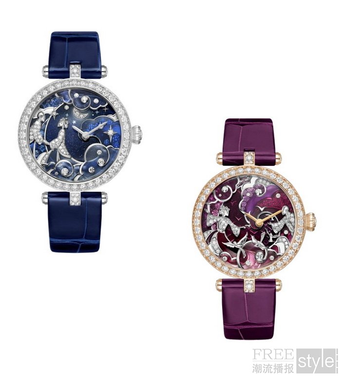 Lady Retrouvailles Célestes腕表则以精湛工艺演绎氤氲着粉紫霞光的重逢序曲。表盘背景以内填珐琅铺就温润底色,含蓄映照两位主人公内心的离愁别绪。一双恋人伫立于一弯淡紫色蓝宝石新月前,双臂舒展,姿态如翼,在白K金喜鹊筑起的空中桥梁遥相对望,仿佛正在等待彼此重逢。彩色玻璃珐琅云朵和轻纱构成飘渺仙境,与点缀其中的美钻交相辉映,为这一动人场景洒下晶莹剔透的光芒。