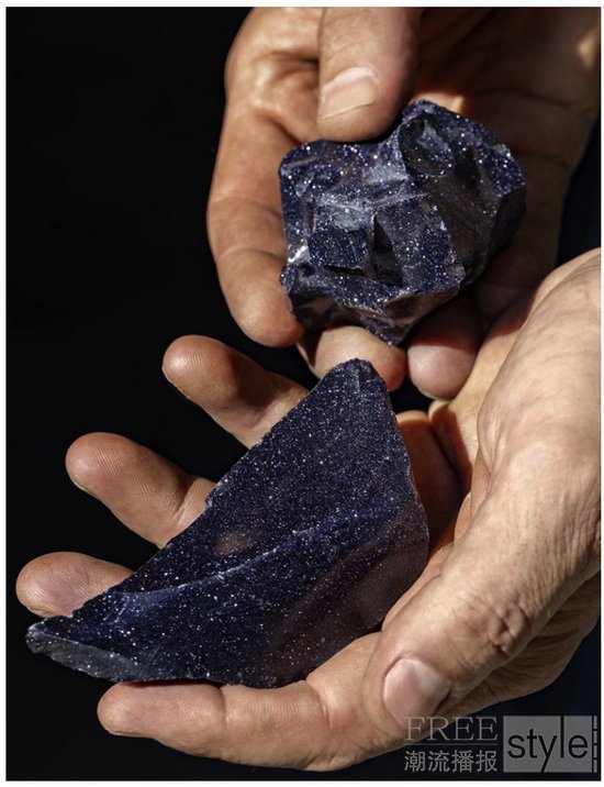 砂金石玻璃产自穆拉诺,先按传统玻璃制作手法以1,200°C高温烧制。由于坩埚内含矿石,使玻璃成品染上深蓝色调,绽放闪烁光芒。坩埚须待完全冷却后,方可以锤子破开,这个步骤往往需耗时一个月。
