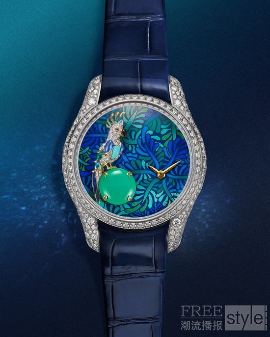 “天堂鸟”主题鹦鹉造型腕表搭配海军蓝鳄鱼皮表带,限量发行10枚。