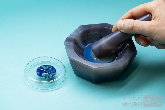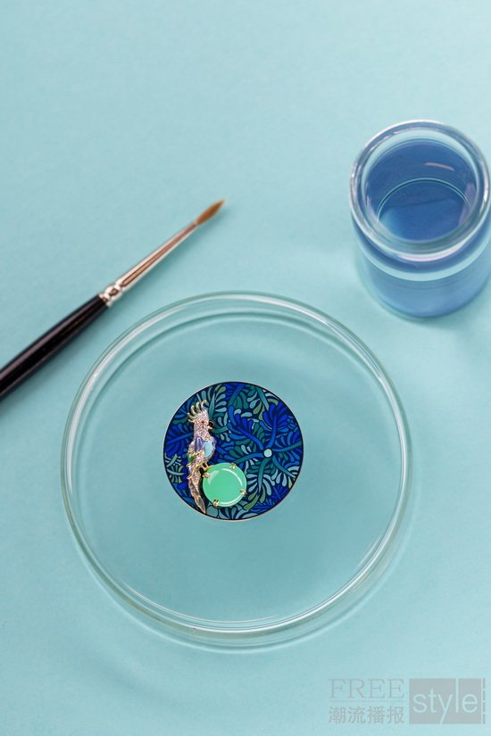 “天堂鸟”鹦鹉造型以18K黄金打造,镶嵌白钻,鸟喙由缟玛瑙雕琢而成,眼部点缀粉色蓝宝石,鸟身则以绿松石勾勒。冠羽与斑斓羽饰皆以手工精细描绘,毫末毕现,与璀璨钻石形成鲜明对比。整只小鸟共镶嵌70颗宝石(包括1颗粉色蓝宝石和69颗钻石),融合微型雕刻、宝石镶嵌与手工绘饰三大工艺,历经32小时匠心雕琢。重2.5克拉蛋面形切割绿玉髓打造的底座翠色明艳,与珐琅表盘的蓝绿色调交相辉映。