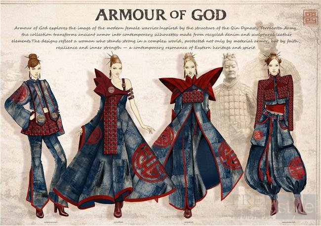 在东西方时尚美学碰撞中,设计师致力于寻找“和而不同”的共鸣,他们将东方戏曲的写意程式与欧洲宫廷的华丽张力巧妙融合,从古代军事甲胄中汲取灵感,利用回收牛仔布与皮革重塑当代女性的精神“铠甲”。有创作者将书法中草书字体的气韵注入发光光纤,实现书法墨迹与科技材质的灵动共生与光影流转,让千年笔墨在现代面料上跃动成诗。
